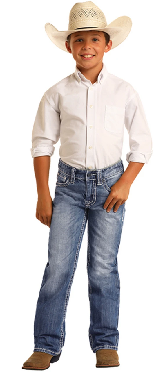 Boys BB Gun Regular Fit In Denim Vintage With Double V Embroidery On Both Back Pockets. Brushed Silver Trims, Ivory TopStitching, And Zip Fly.