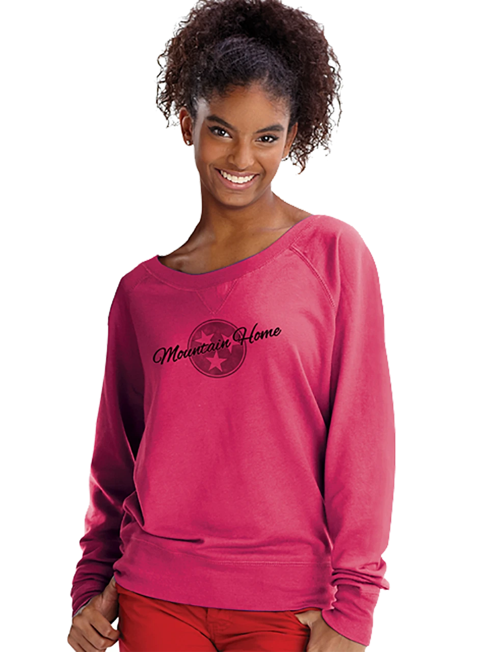 If you are tender about Tennessee like we are, you will love the Women’s “Mountain Home” Slouchy Pullover with Tri Star! This women’s pullover features a wide scoop neck, long raglan sleeves, wide bands at the wrist and hem, and “Mountain Home” and Tri Star graphic on the front.
